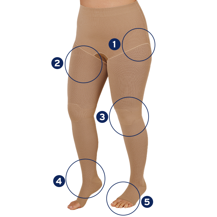 Anatomisch angepasstes, außen höher geformtes Gestrick. Verbessert den Halt und Sitz und trägt zur Vermeidung zirkulärer Einschnürungen und Blockaden bei.